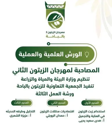 افتتح سعادة وكيل إمارة منطقة الباحة سعادة الأستاذ عبدالمنعم ياسين الشهري مهرجان الزيتون الثاني وتضمن حفل الافتتاح تدشين مصنع الجمعية التعاونية للزيتون والذي يحتوي على معصرة حديثة تخدم مزارعي الزيتون بالمنطقة كما تم تكريم أمين مجلس الجمعيات التعاونية والرعاة والداعمون للمهرجان